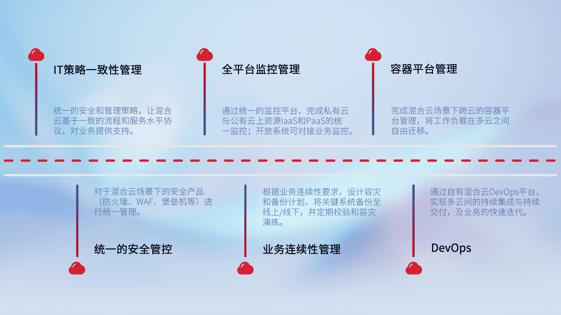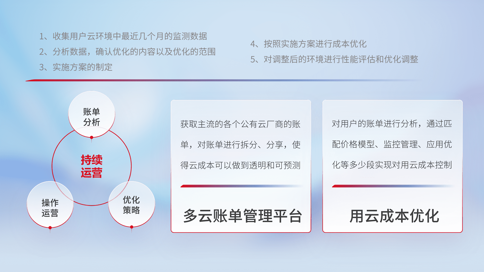 通过多云纳管,,,,以统一的资源数据模型把客户的云资源进行抽象和封装,,,,进而实现对多云资源的统一操作,,保障云资源管理的可靠性、、、稳定性与可用性。。量身定制化运维内容,,配置、、、开发运维、、、补丁管理、、、备份、、监控、、、认证和访问管理、、、审计和日常巡检等,,保障在用云过程中的可靠度,,稳定度以及高可用率。。