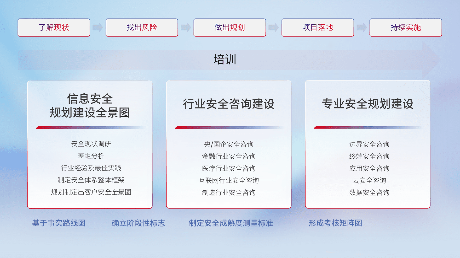 针对客户行业特性,,,以专业的安全服务+多厂商联合解决方案提供专属的一站式安全管理服务,,帮助客户全面感知网络空间威胁,,,基于识别、、、、检测、、、、分析、、、、防护、、监测、、、、响应的服务理论模型,,从方案咨询、、集成交付、、评估验证、、、优化加固、、、、运维运营,,致力于为客户提供完整的闭环管理式安全服务。。以实战经验为客户打造高抵御风险的安全体系,,帮助客户发现威胁、、、、对抗威胁、、、处置威胁,,,,不断积累安全对抗能力,,持续保障数字化安全。。。。