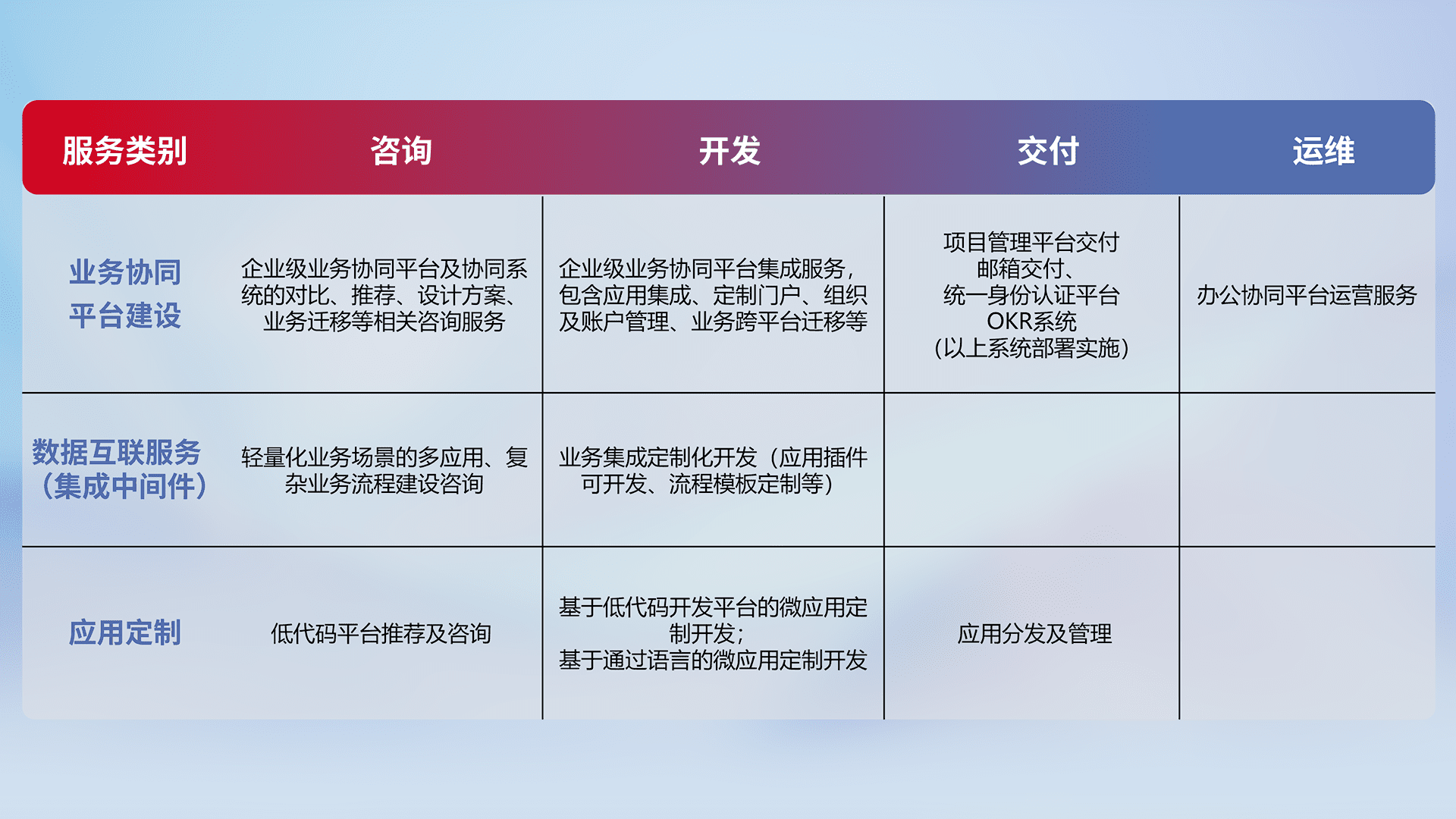 针对钉钉、、企微、、IDaas等平台级产品提供产品的规划、、方案、、、交付、、定制化开发等服务,,,实现如统一协同办公、、、、智能客户服务、、混合会议管理、、、智能数据查询、、、等业务场景,,,实现数字化转型。。